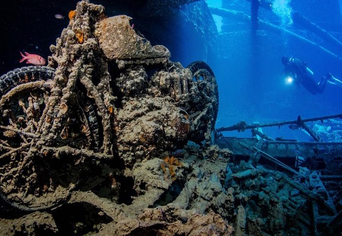 Naufrágios com motos e tanques de guerra, muitos recifes coloridos e as famosas pirâmides.